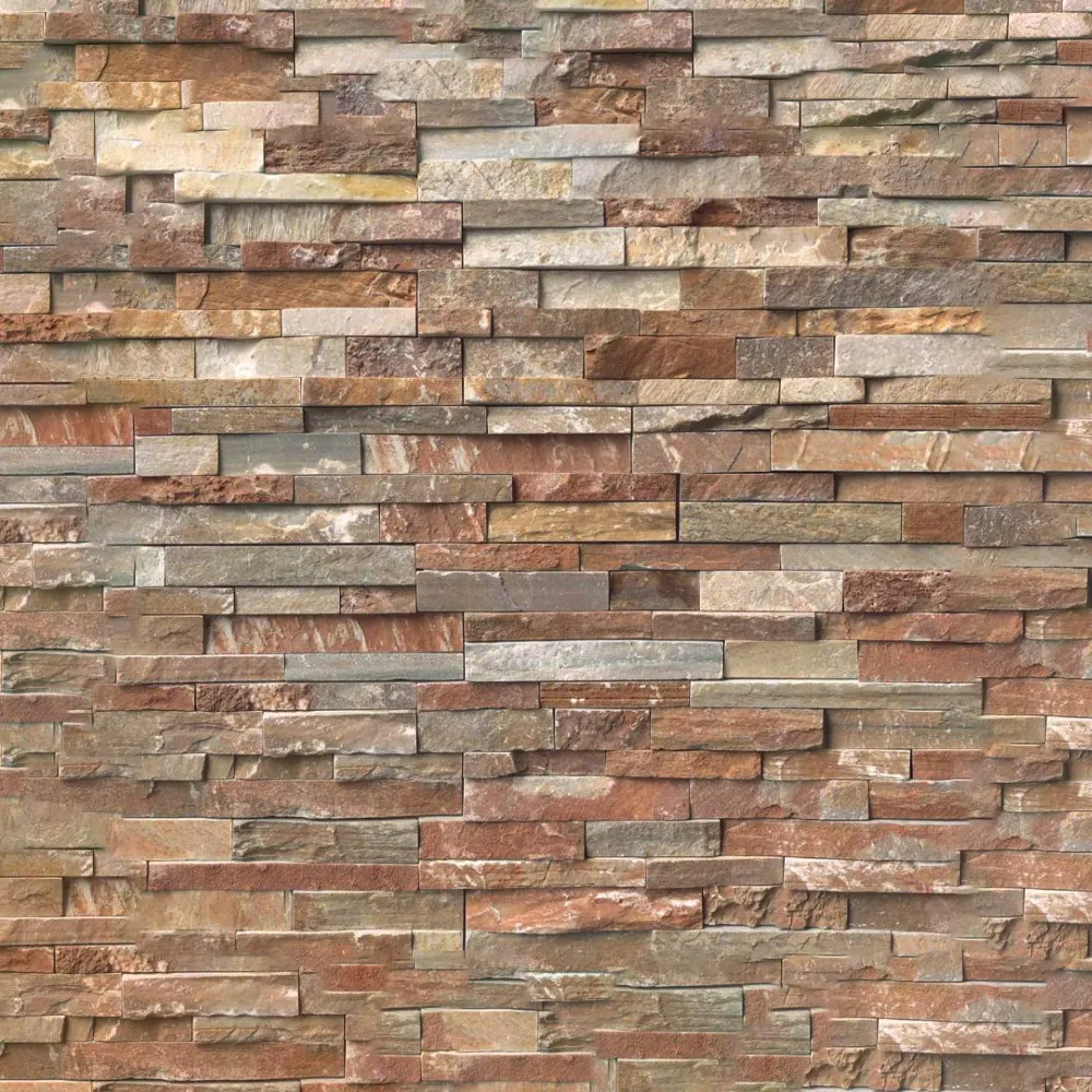 Golden White Stacked Stone panels are crafted from split face natural quartzite. The soft grays, warm golds, and creams contrast beautifully against the rich red tones.