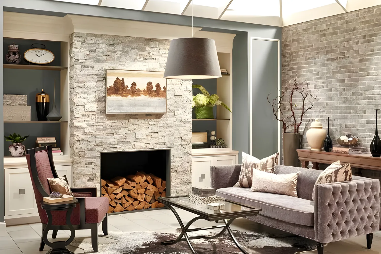 Silver Travertine Stacked Stone panels feature soft warm gray tones. The natural split face finish lends a refined rustic nature.